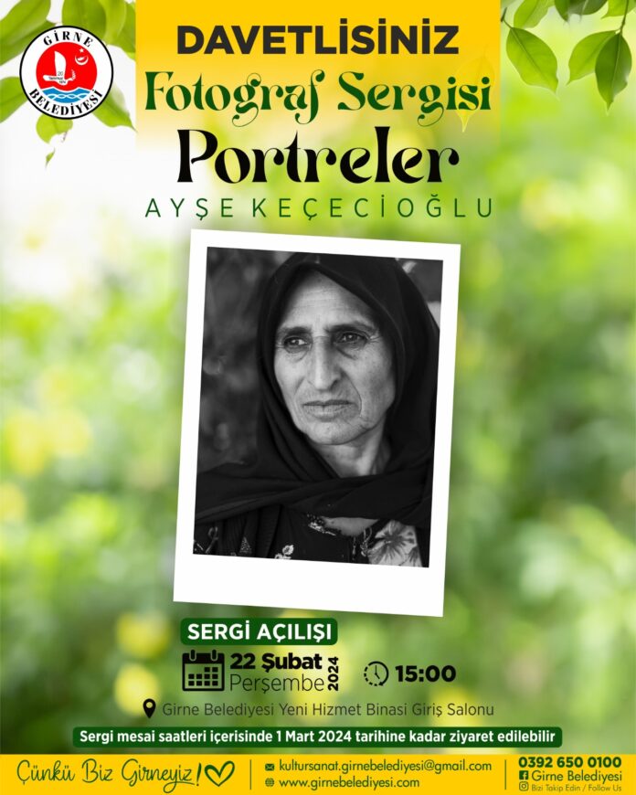 Fotoğraf sanatçısı Ayşe Keçecioğlu’nun “Portreler” isimli sergisi, Girne Belediyesi’nin yeni hizmet binasında 22 Şubat Pazartesi günü ziyarete açılacak.