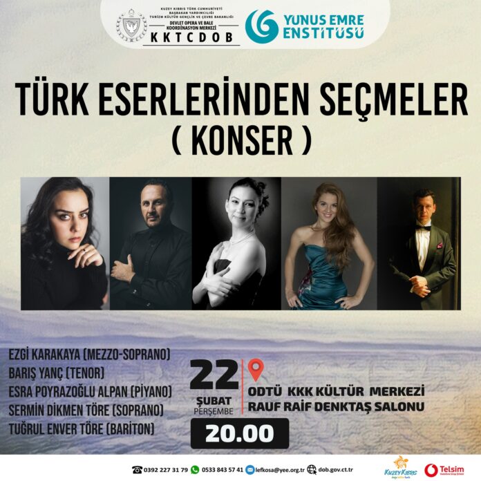 Devlet Opera ve Bale Koordinasyon Merkezi (KKTCDOB) ve Lefkoşa Yunus Emre Enstitüsü iş birliğinde “Türk Eserlerinden Seçmeler ” konseri perşembe günü saat 20.00’de Kalkanlı ODTÜ Kuzey Kıbrıs Kampüsü Kültür Merkezi’nde yapılacak.