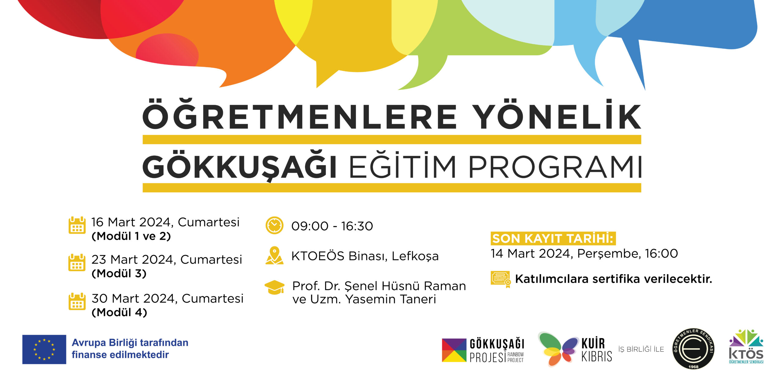 Avrupa Birliği tarafından Kıbrıslı Sivil Toplum İş Başında VII Hibe Programı kapsamında finanse edilen ve Kuir Kıbrıs Derneği tarafından yürütülen Gökkuşağı Projesi çerçevesinde düzenlenecek eğitimler 16, 23 ve 30 Mart tarihlerinde 09.00-16.30 saatleri arasında KTOEÖS Lefkoşa binasında gerçekleştirilecek.