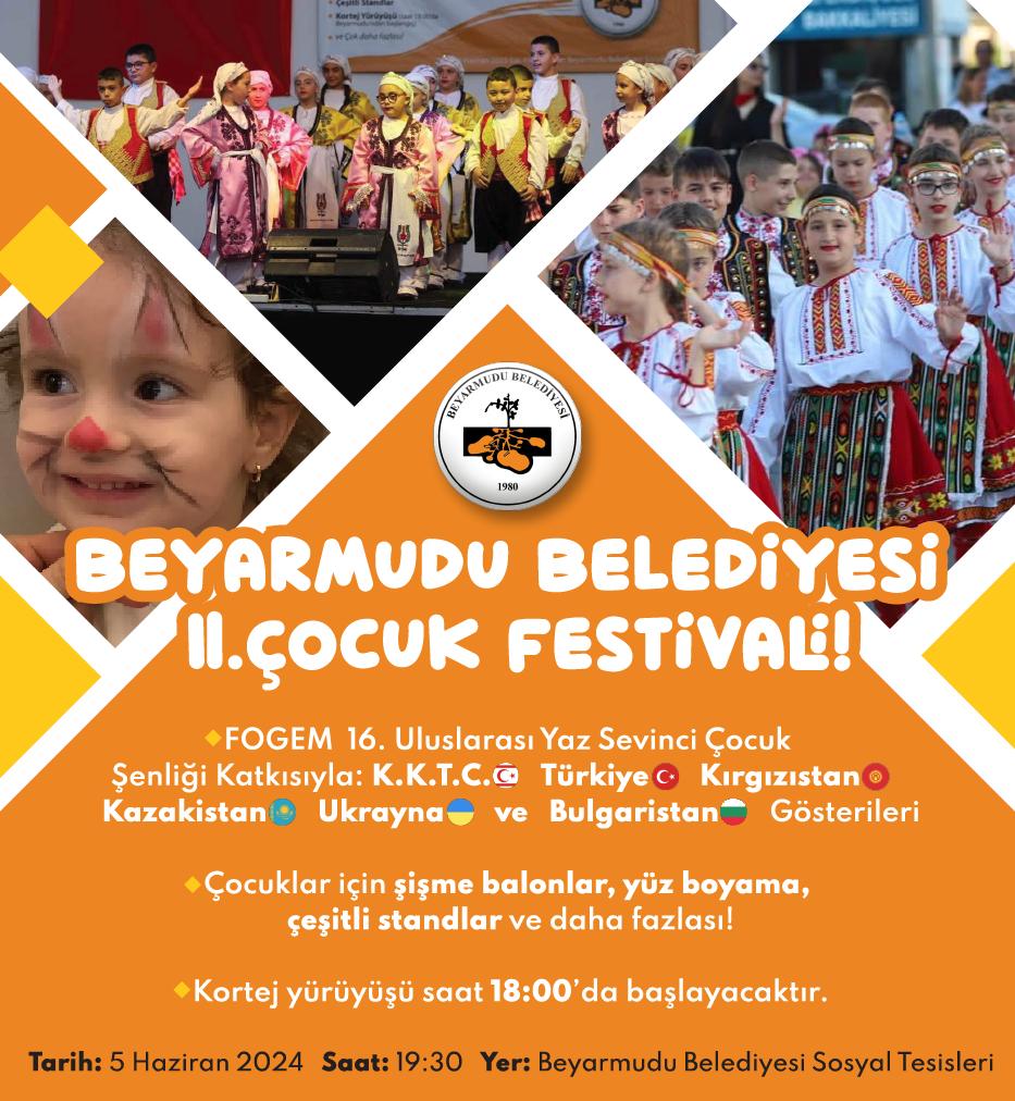 Beyarmudu Belediyesi II. Çocuk Festivali, FOGEM 16. Uluslararası Yaz Sevinci Çocuk Şenliği katkısıyla, 5 Haziran Çarşamba günü yapılıyor.
