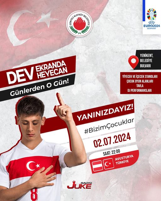 22.00’de oynanacak maç için Yenikent Belediye Bulvarı’nda kurulan dev ekranın yanı sıra, yiyecek ve içecek stantları, Çocuk oyun alanları ve DJ performansları ile unutulmaz bir geceye hazır olun!