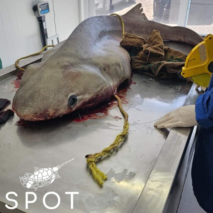 “Bizler bu özel günde sizlerle şaşkınlıkla gerçekleştirdiğimiz bir nekropsiden bulguları paylaşmak istiyoruz. Fotoğrafta görmüş olduğunuz köpekbalığı ”Boz Camgöz (Hexanchus Griseus)” İş birliği içerisinde çalıştığımız bir balıkçının ağlarına yanlışlıkla hedef dışı av olarak takıldı. Balıkçımız 1188 Ölü veya Yaralı Deniz Canlıları İhbar Hattı üzerinden hemen bizimle iletişime geçti ve bu sayede bu köpekbalığına nekropsi yapabildik. Fotoğraflarda görebileceğiniz üzere, bu köpekbalığının midesinden ENDÜSTRİYEL PLASTİK POŞET çıktı. Acı bir gerçektir ki, balıkçılıların ağlarında hedef dışı av olarak yakalanmalarının yanı sıra plastik kirliliği de köpekbalığı popülasyonlarını etkiliyor.