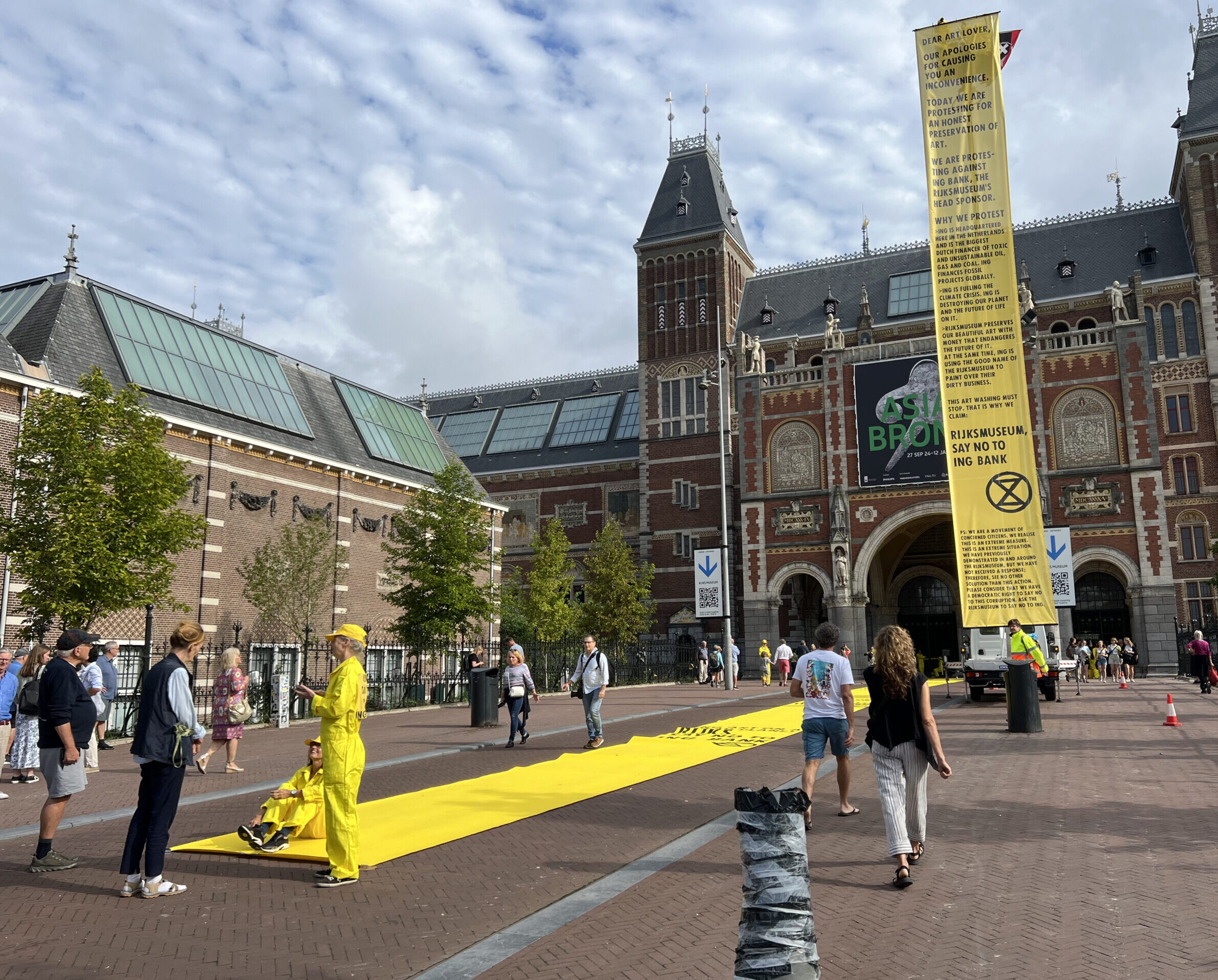 Göstericilerden biri, “Bugün Rijksmuseum önünde bu eylemi gerçekleştiriyoruz. Rijksmuseum’un ING’yle bağını kesmesini istiyoruz. ING, fosil yakıt endüstrisini finanse ederek hatalı bir iklim politikası uyguluyor.” iddiasında bulundu.