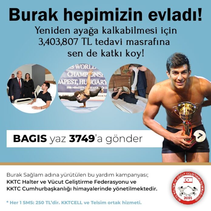 KKTC Halter ve Vücut Geliştirme Federasyonu milli sporcusu, Dünya Fitness üçüncüsü 27 yaşındaki Burak Sağlam’ın tedavi masrafları için bağış toplanıyor.