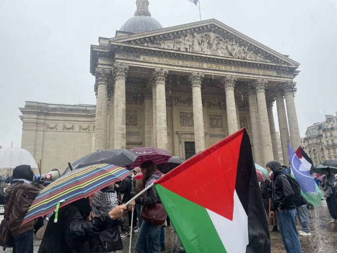 Filistin destekçisi öğrenciler, kötü hava koşullarına rağmen Paris’te Pantheon Meydanı’nda bir araya geldi.
