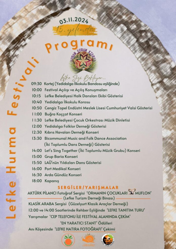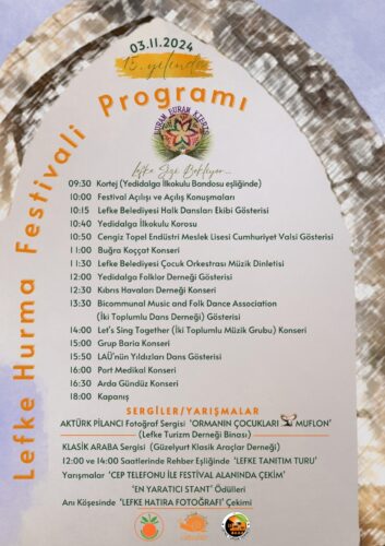 Kıbrıs’ın hurmasıyla ünlü kenti Lefke’deki Festival, Lefke Çarşı merkezinde 09.30- 18.00 saatleri arasında düzenlenecek.