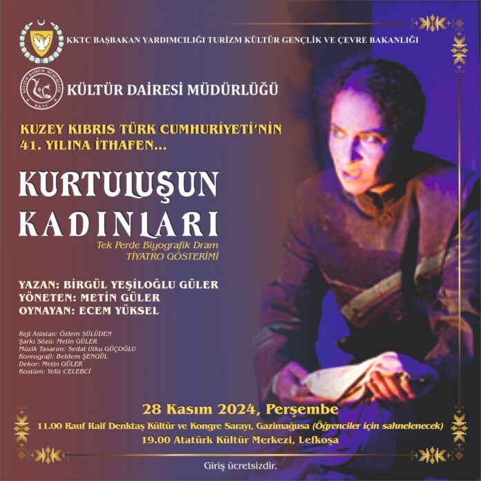 Başbakan Yardımcılığı, Turizm, Kültür, Gençlik ve Çevre Bakanlığı’na bağlı Kültür Dairesi, KKTC’nin kuruluşunun 41. yılına ithafen, “Kurtuluşun Kadınları” adlı tiyatro oyununu sanatseverlerle buluşturuyor.