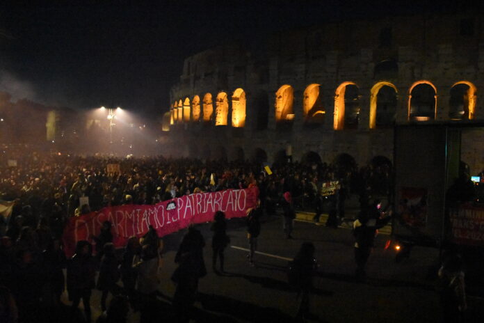 Kolezyum önünden geçerek Vittorio Emanuele Meydanı’na kadar yürüyen on binlerce kişi, kadınlara yönelik şiddet ve ataerkil şiddete karşı tepkilerini ifade etti.