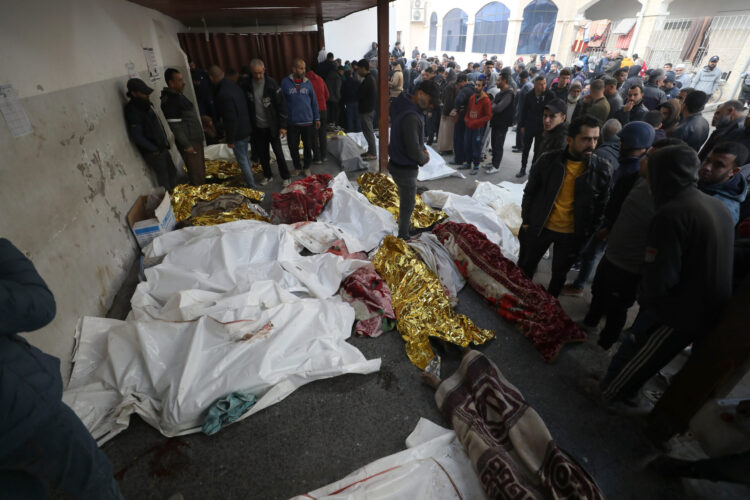 Saldırılarda yaşamını yitiren Filistinlilerin naaşları, cenaze işlemleri için El Ehli Baptist Hastanesi’ne getirildi.