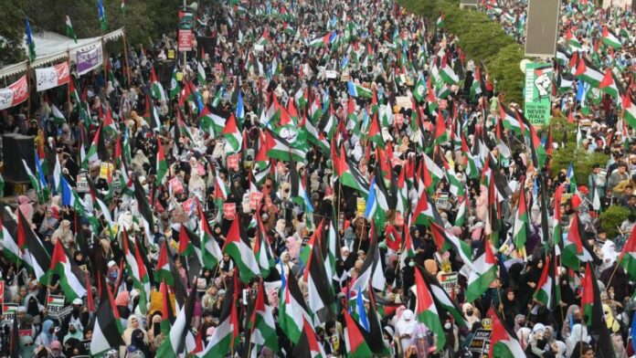 Dawn gazetesinin haberine göre, Cemaat-i İslami (JI) partisi ve İslam Uleması Cemiyeti (JUI-F) öncülüğünde binlerce kişi Karaçi kentinde toplandı.