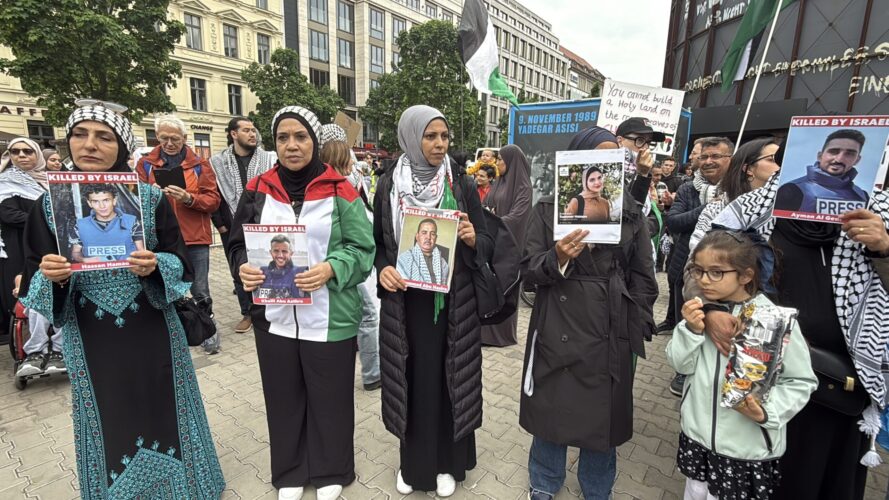 Mitte semtindeki Friedrich ve Zimmer caddelerinin kesiştiği meydanda Filistin’i desteklemek ve İsrail’in Gazze’ye yönelik saldırılarını protesto etmek için 200’ün üzerinde kişi toplandı.