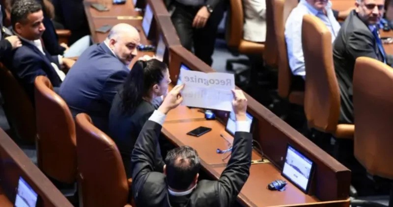 Filistin asıllı milletvekili Eymen Avde, daha sonra sosyal medya hesabından, “Filistin’i tanıyın.” yazılı pankartı tuttuğu fotoğrafını paylaştı.