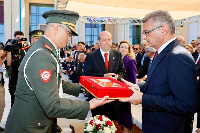 Konuşmaların ardından Cumhurbaşkanlığı forsu gönderden indirilerek Erhürman’a takdim edildi, yeni Cumhurbaşkanlığı forsu göndere çekildi.