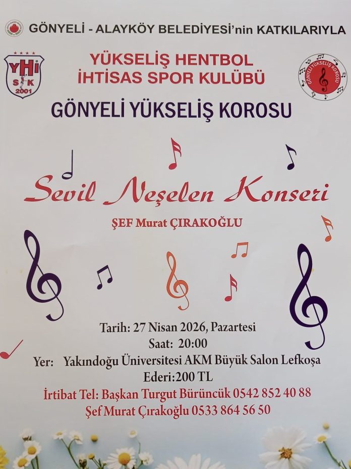 Gönyeli-Alayköy Belediyesi’nin katkılarıyla, Yükseliş Hentbol İhtisas Spor Kulübü bünyesinde faaliyet gösteren Gönyeli Yükseliş Korosu yarın akşam “Sevil Neşelen” konseri gerçekleştirecek.